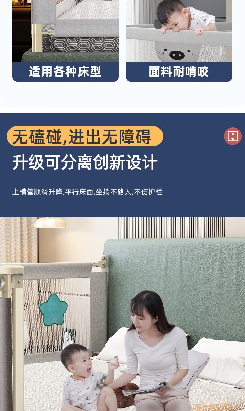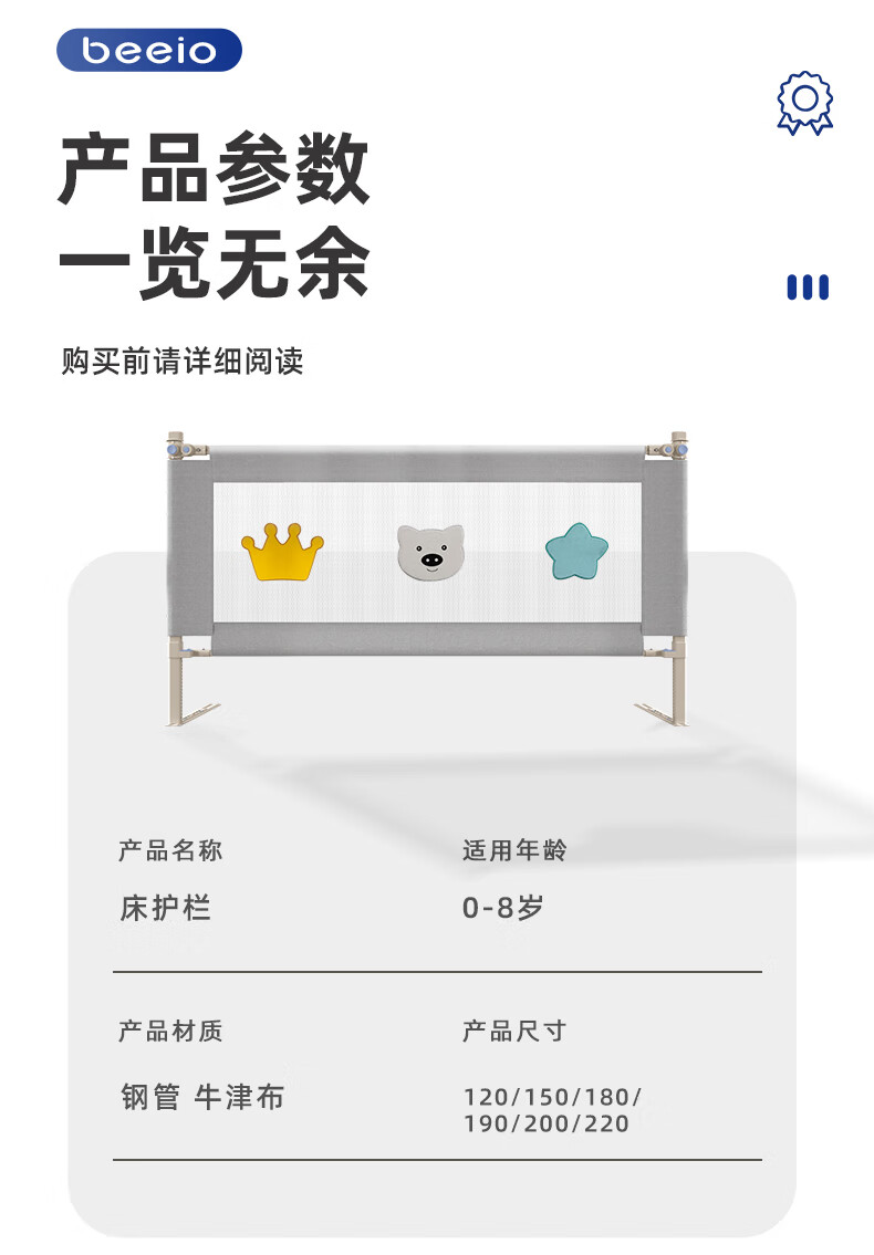 Beio Bear, German bed rail, baby children's fall prevention bed rail, baby fence bed, three sides safety, bed side fall prevention cover, embroidered with light gray stars of 2.2 meters [anti suffocation], 1 piece, 1 pack [image price, brand quotatio...