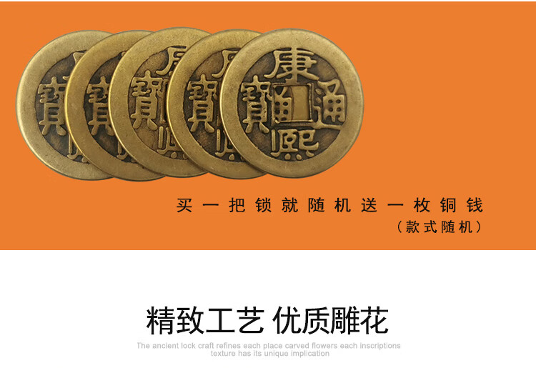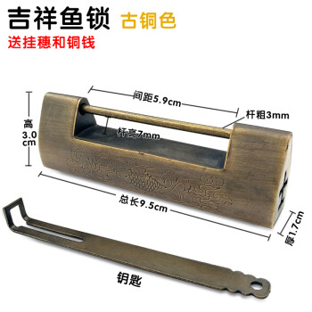 Fourth generation copper hall pure brass lock, old-fashioned small copper lock, mini cabinet door lock, small lock, Chinese antique copper lock, retro hanging horizontal lock, auspicious fish length 9.5cm, spacing 5.9cm, ancient copper color